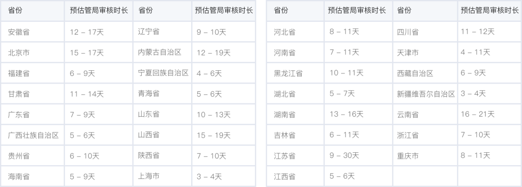 各個省管局預(yù)計(jì)審核時長,實(shí)際審核時長會根據(jù)備案場景有所不同,下表格僅供參考。詳情可查看 詳細(xì)規(guī)則。